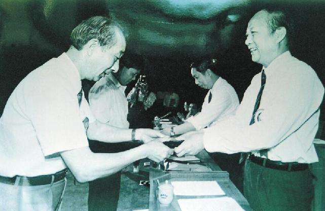 1992年4月29日,时任深圳市市长郑良玉为荣获“全国五一劳动奖章”的公司总经理沈正中颁奖。