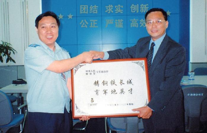2002年,张华向中国人民解放军空军政治部赠送牌匾。