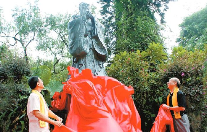 2009年,张华(左)与原深圳市市长郑良玉(右)共同为孔圣像揭幕。