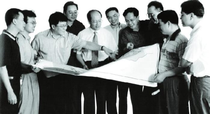 1999年,王富海(左三)与深圳城市规划设计研究院同事正在讨论业务。