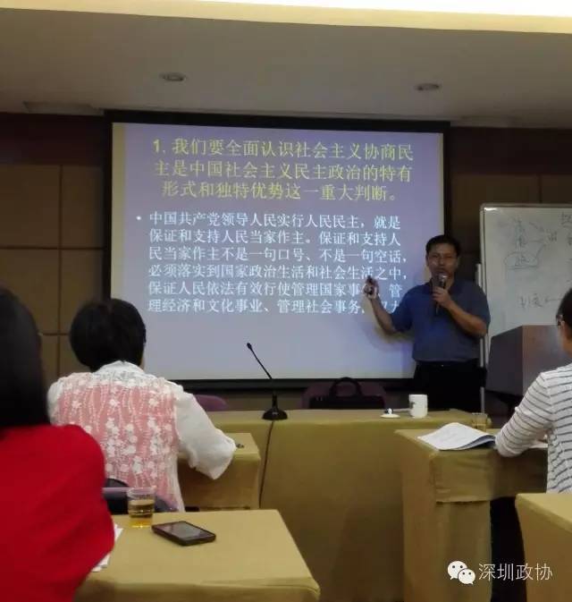 25日下午的培训中,厦门市委党校副教授王刚博士作了《充分发挥我国社会主义政治制度优越性》的专题讲座,重点围绕“适合中国国情的社会主义政治制度、社会主义协商民主的独特优势、做好新形势下的统战工作”等问题,深入解读了习近平总书记关于民主政治尤其是人民政协的一系列重要论述。