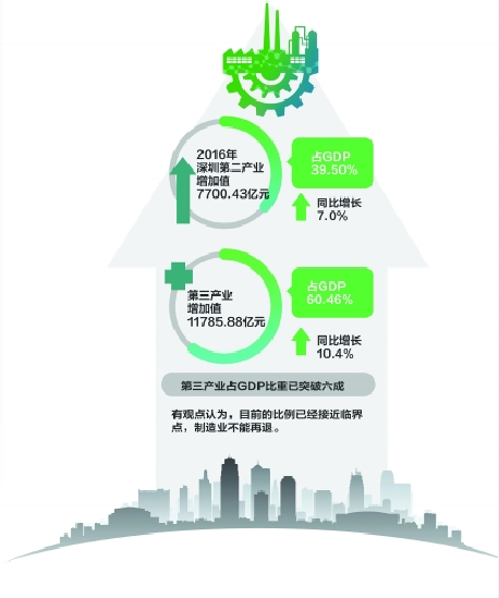 ????据介绍,2016年深圳第二产业增加值7700.43亿元,占GDP的39.50%,同比增长7.0%;第三产业增加值11785.88亿元,占GDP的60.46%,同比增长10.4%。第三产业占GDP比重已突破六成。有观点认为,目前的比例已经接近临界点,制造业不能再退。深圳市政府发展研究中心主任吴思康就认为:盲目追求第三产业的比重会影响城市竞争力,会造成产业空心化;深圳的定位是创新型城市,创新一定要有制造业的支撑,否则创新容易成为无本之木。